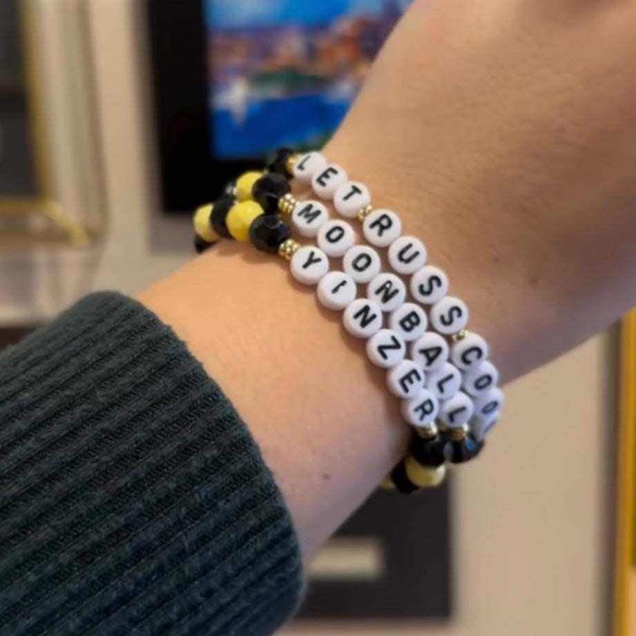 Made with 8mm black faceted beads, 6mm 14k gold-filled beads, “Yinzer” Letter Beads in Black.