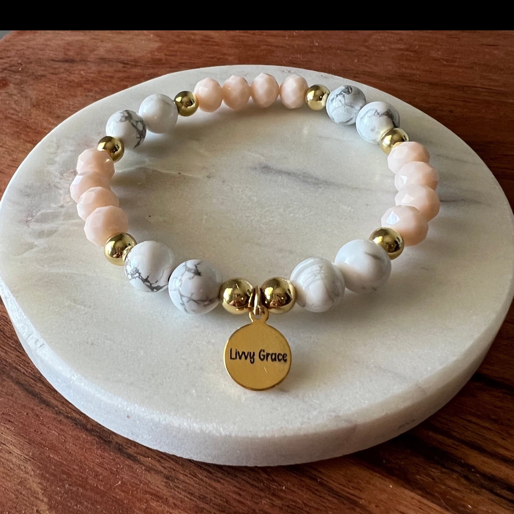 Made with 8mm Howlite semi precious beads, 8mm pink porcelain jade beads, 6mm 14k gold-filled beads.