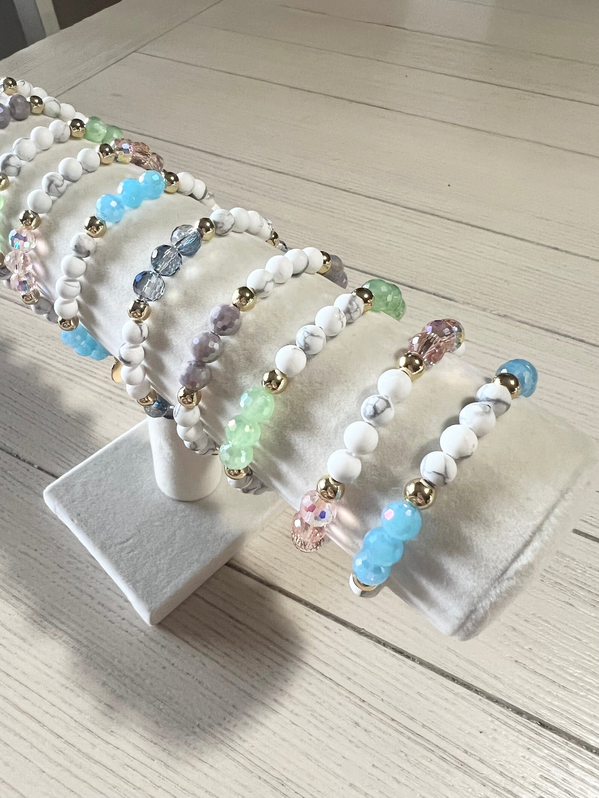 Made with 6mm Howlite semi precious beads, 8mm Summer Blue faceted sparkle beads, 6mm 14k gold-filled beads.