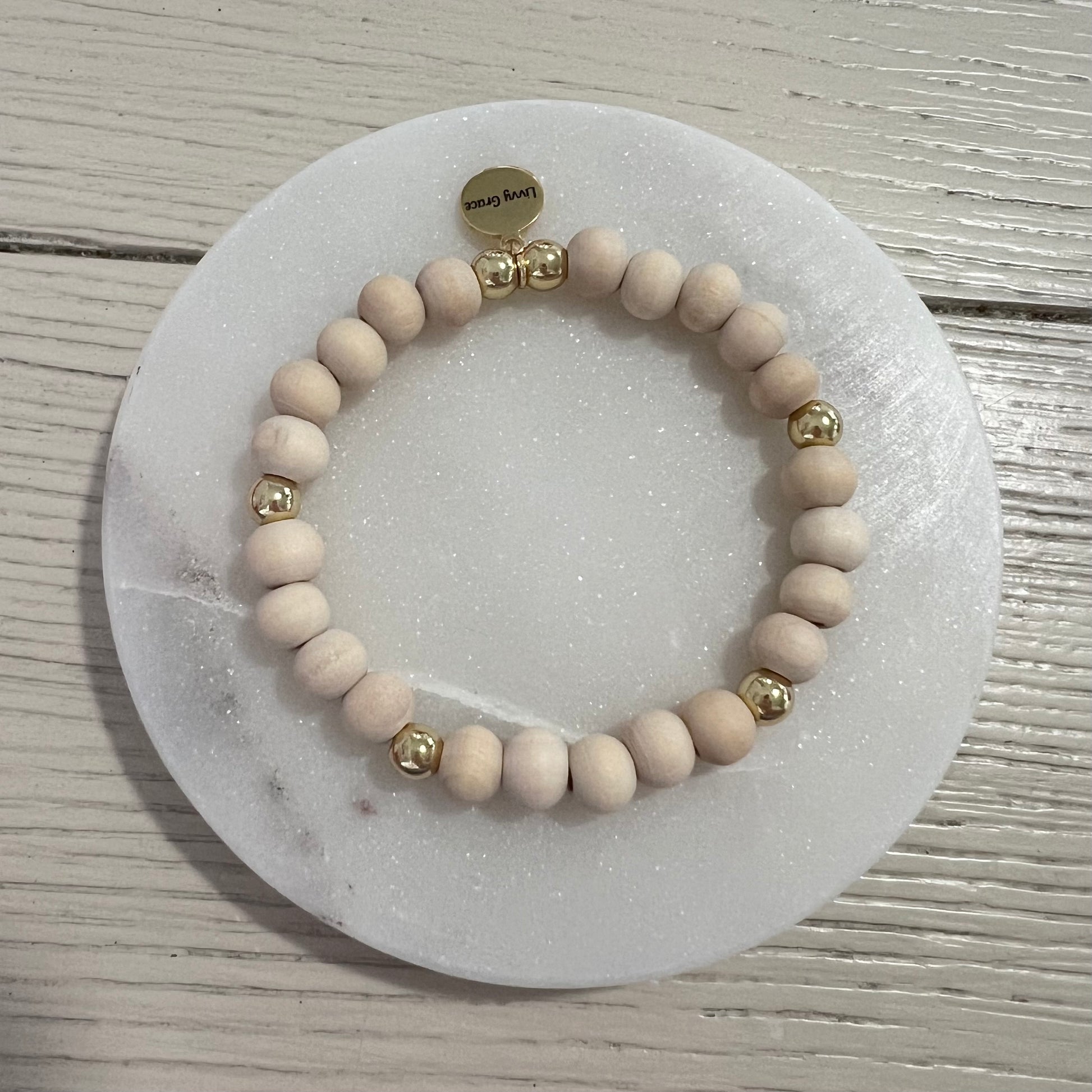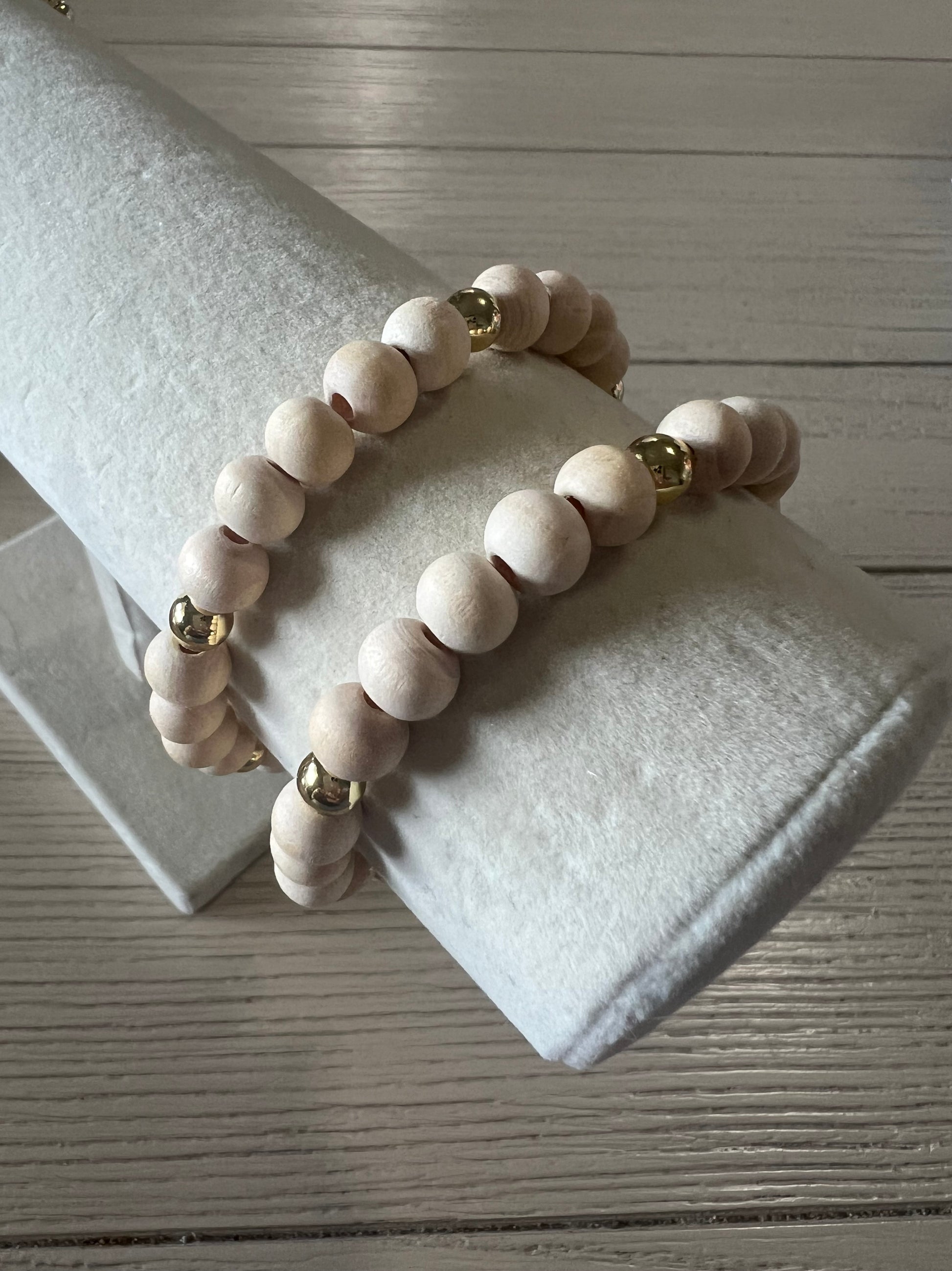 Made with 8mm natural smooth wooden beads, 6mm 14k gold-filled beads.
